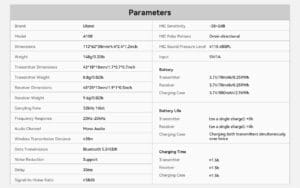 • Compact Design: Both the transmitter and receiver are lightweight (8.8g and 9.6g respectively), making them easy to carry and clip onto clothing.