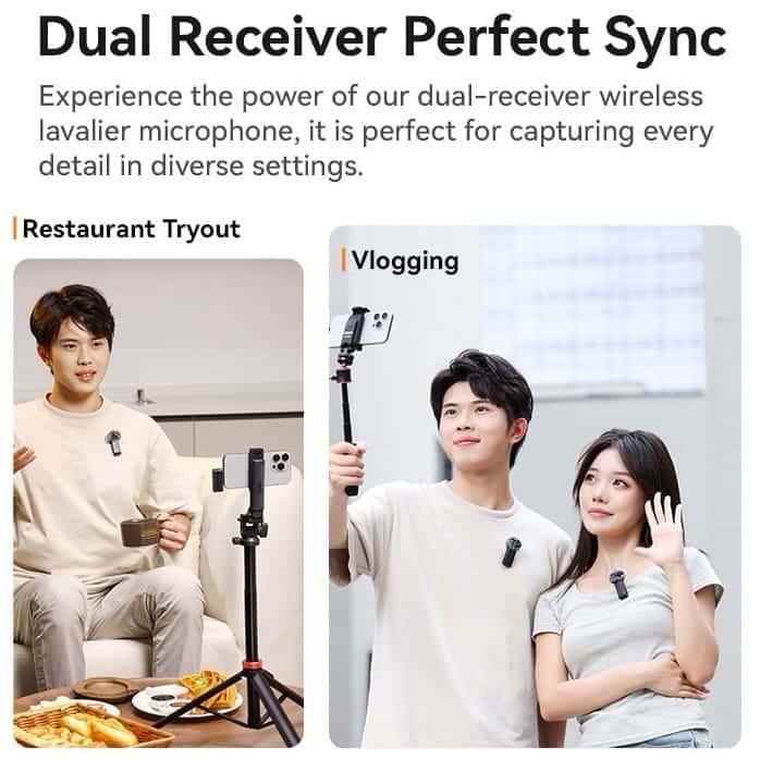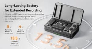 • Long Battery Life: The receiver offers an impressive 24-hour runtime, while the transmitters provide up to 5 hours of usage. The charging case can recharge both transmitters more than twice for extended recording sessions.